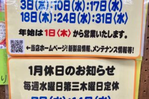 いつもご利用いただきありがとうございます。毎週水曜、第三木曜日定休 3日(水)10日(水)17日(水)18日(木)24日(水)31日(水)をお休みとさせていただきます。年始は1日(木)から営業いたします。